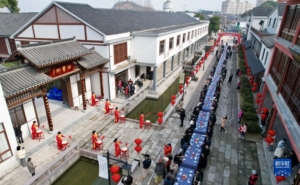 1月17日,在浙江省湖州市德清縣洛舍鎮東衡村長(cháng)桌宴活動(dòng)現場(chǎng),村民與游客共品當地特色佳肴(無(wú)人機照片)。