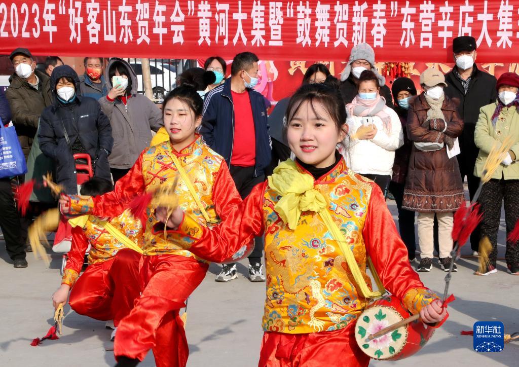 1月17日,在山東省東營(yíng)市東營(yíng)區辛店街道辛店大集,人們表演短穗花鼓。