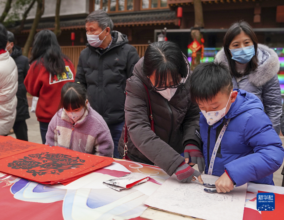 1月17日,市民在南昌市百花洲八一公園的“迎新春 送祝?!被顒?dòng)上制作木板年畫(huà)。