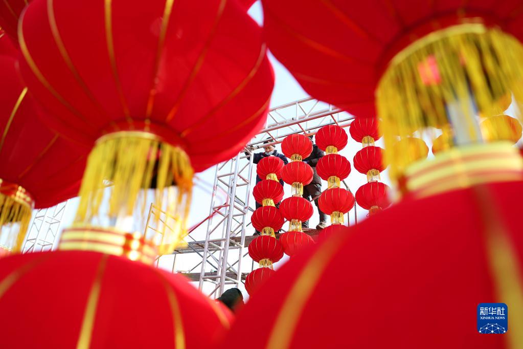 1月17日,工人在山東省青島西海岸新區金沙灘啤酒城安裝燈籠。