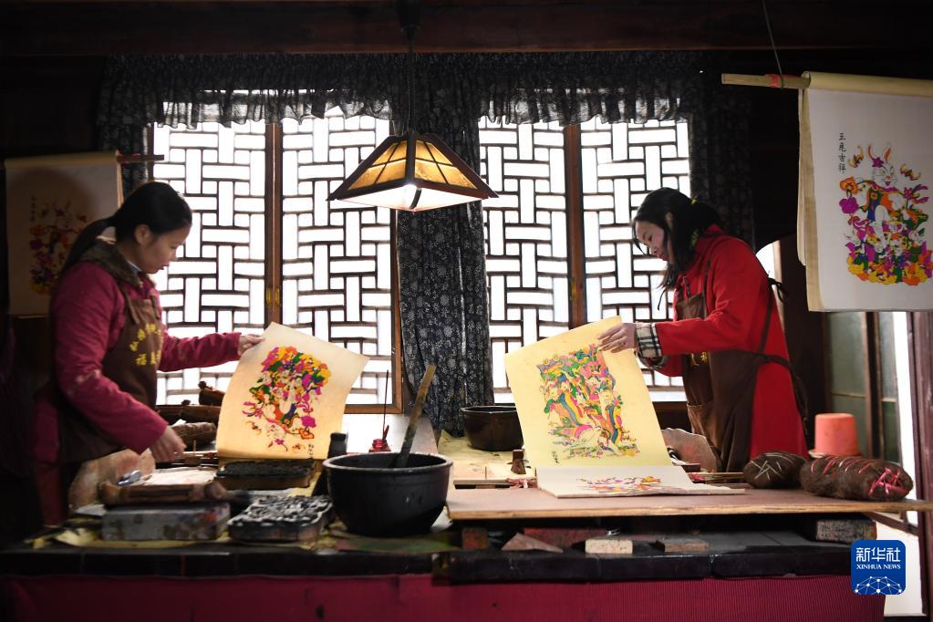 春節臨近,湖南省邵陽(yáng)市隆回縣灘頭鎮的木版年畫(huà)作坊加班加點(diǎn)趕制年畫(huà),供應春節市場(chǎng)。