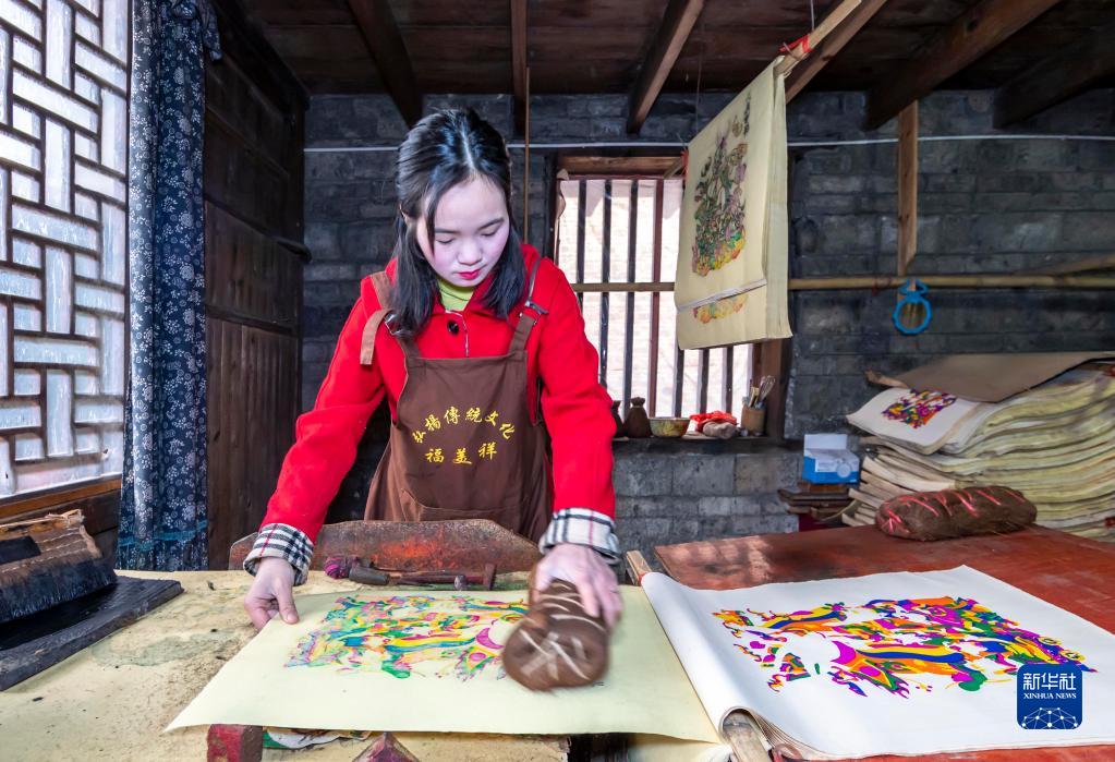 春節臨近,湖南省邵陽(yáng)市隆回縣灘頭鎮的木版年畫(huà)作坊加班加點(diǎn)趕制年畫(huà),供應春節市場(chǎng)。