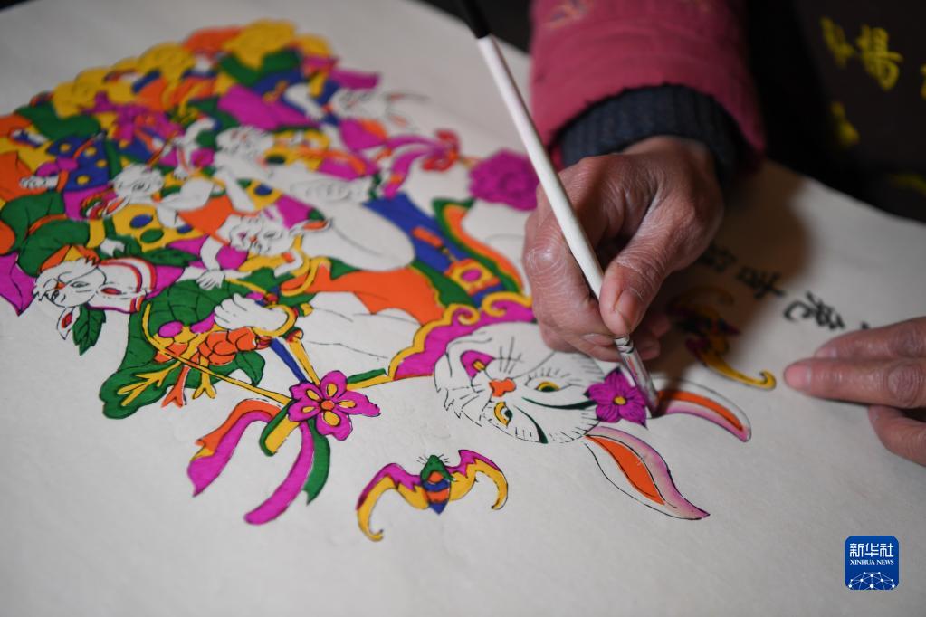 1月17日,在灘頭鎮福美祥年畫(huà)作坊,年畫(huà)藝人尹冬香在年畫(huà)上加入手繪使年畫(huà)更加靈動(dòng)。