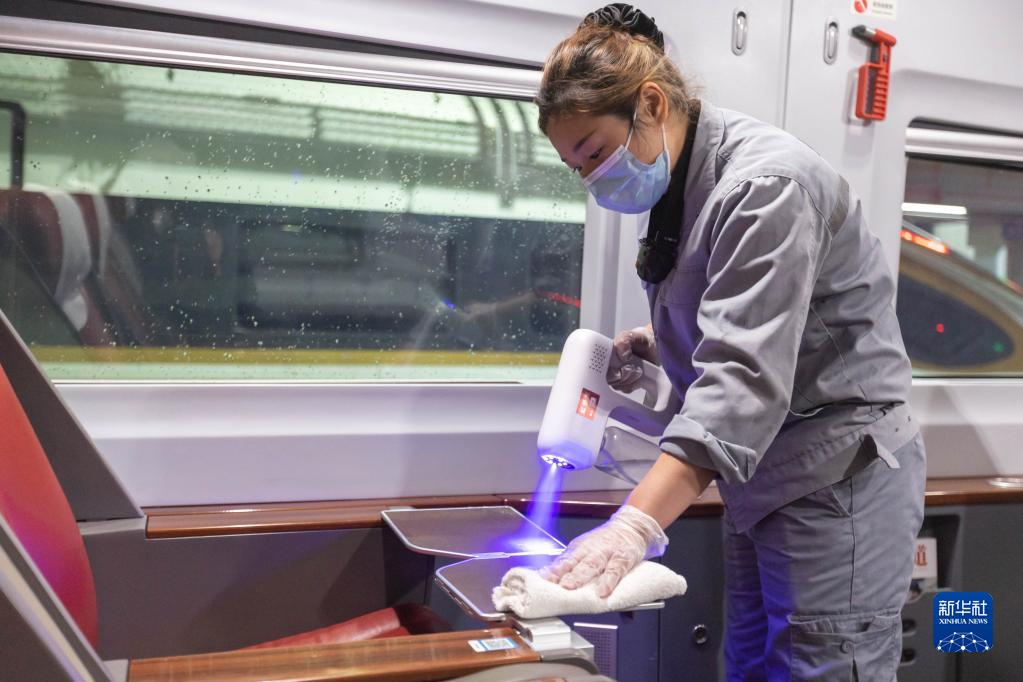 1月16日,工作人員在列車(chē)內進(jìn)行消毒作業(yè)。
