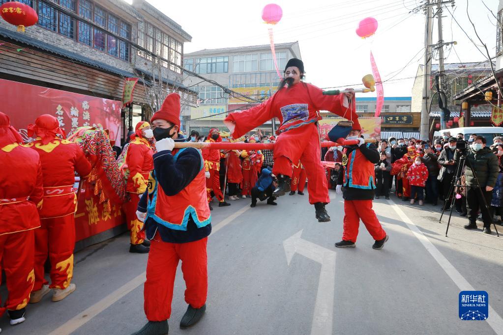 1月17日,在濉溪縣臨渙鎮,民俗藝人在表演獨桿轎。
