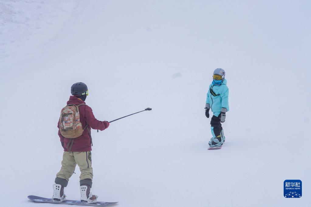 都宇用運動(dòng)相機為兒子都軒銘(右)拍攝視頻(2023年1月14日攝)。