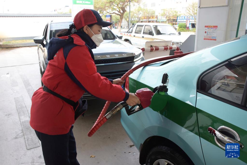1月17日,云南省蒙自市一加油站工作人員給汽車(chē)加油。