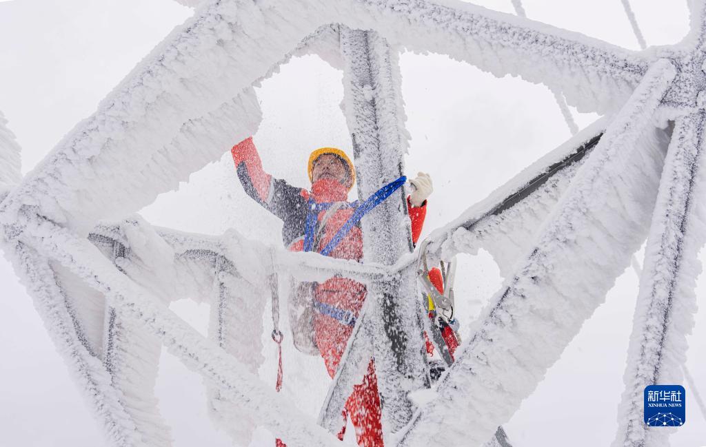 1月17日,在湖北省鶴峰縣山區,應急搶險人員在鐵塔上除冰雪。