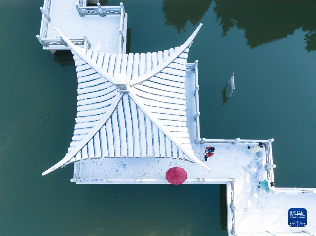 1月15日,在江蘇省宿遷市泗洪縣,游客在雪后的梅園內賞景(無(wú)人機照片)。