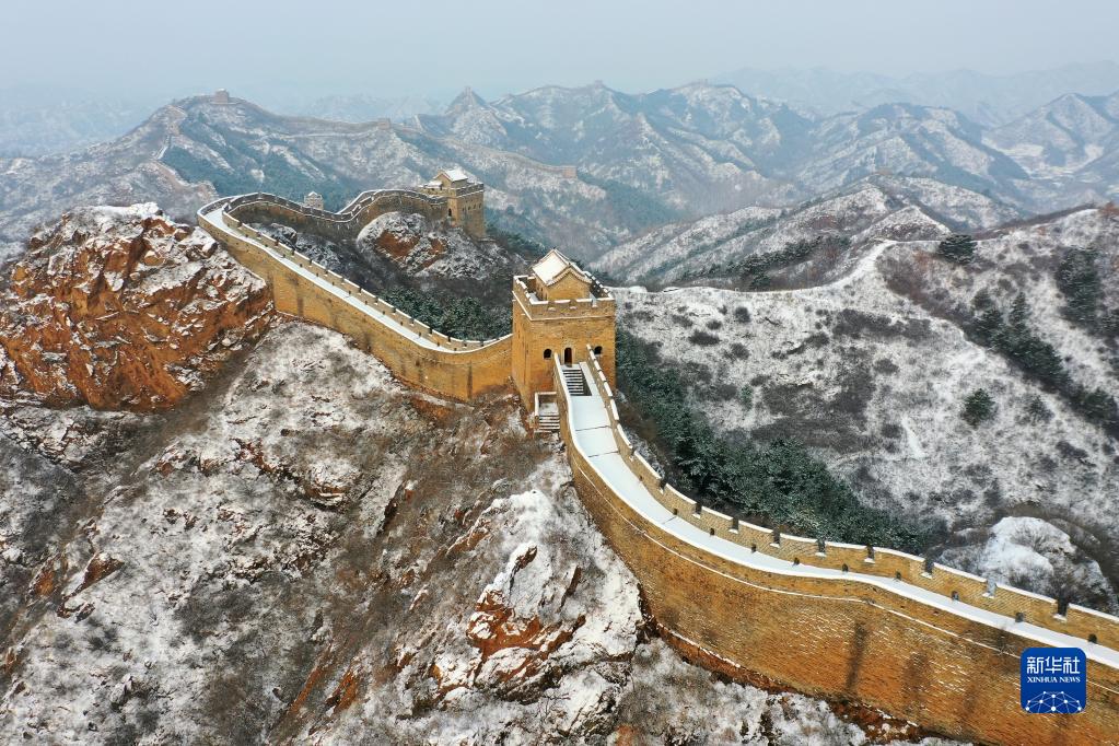 1月13日在河北省承德市灤平縣拍攝的金山嶺長(cháng)城雪景(無(wú)人機照片)。