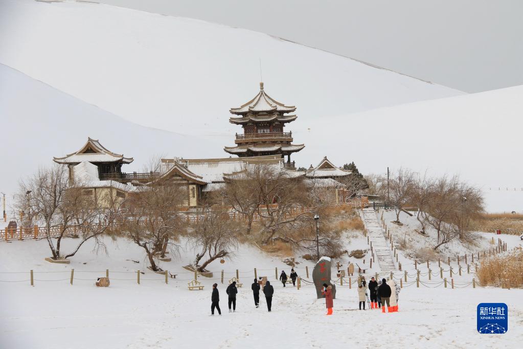 1月13日,游客在甘肅省敦煌市鳴沙山月牙泉景區賞雪游玩。