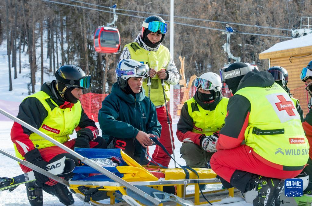 在新疆阿勒泰地區富蘊縣可可托?;﹫?chǎng),買(mǎi)依爾別克·赤合斯(左二)與雪場(chǎng)救援隊同事一起進(jìn)行安全救援演練(2022年12月26日攝)。
