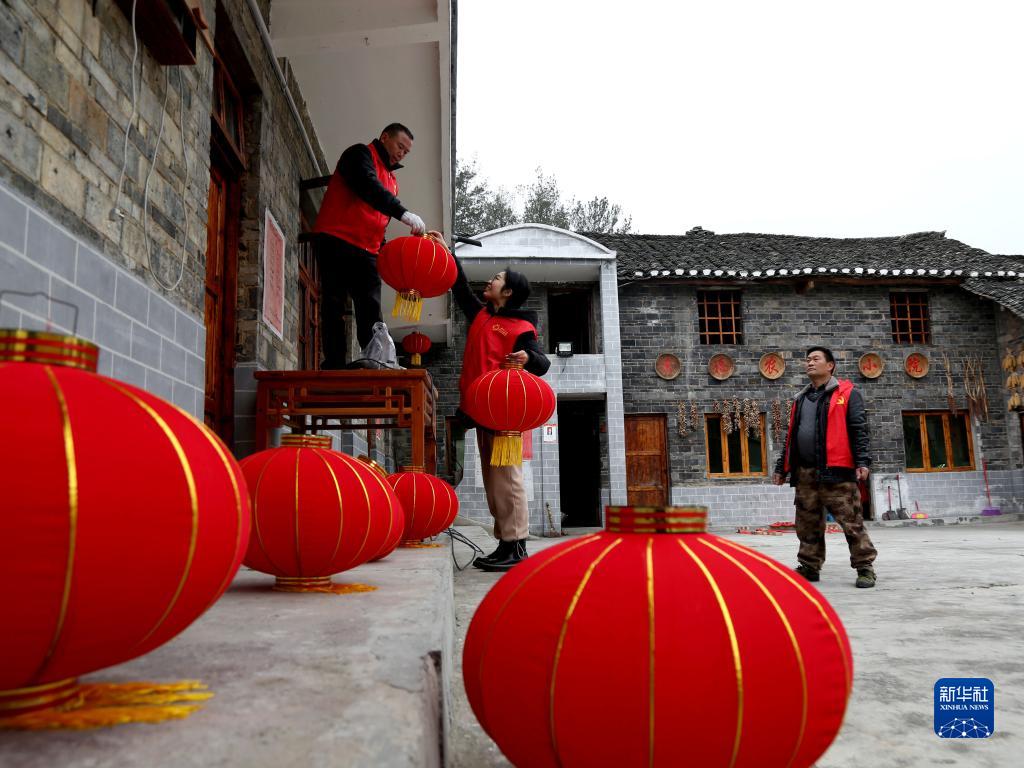 1月17日,黨員志愿者在貴州省黔南布依族苗族自治州龍里縣灣灘河鎮翠微村的養老育幼互助服務(wù)站點(diǎn)——“幸福農家小院”掛燈籠。