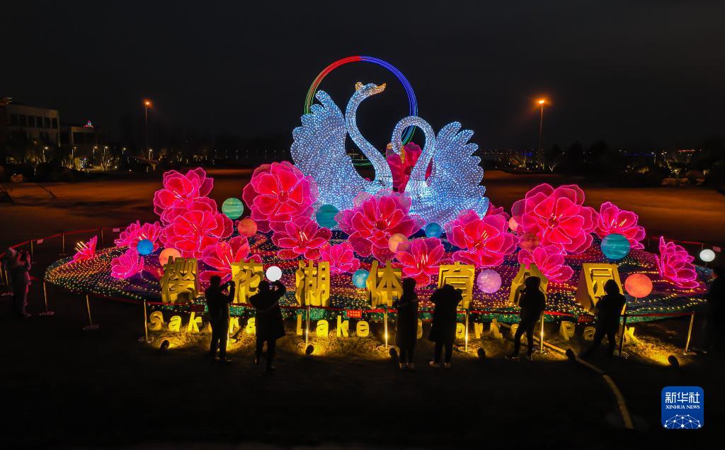 1月17日夜晚,在山東省榮成市櫻花湖體育公園,市民在“天鵝花燈”前拍照、打卡。