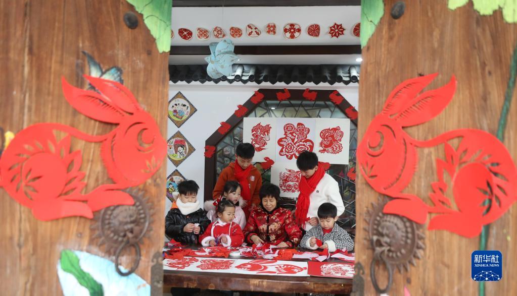 1月18日,在湖南省衡陽(yáng)市衡東縣文化館剪紙非遺傳習所,衡東縣剪紙非遺傳承人廖哲定(左四)指導小朋友們剪兔子。