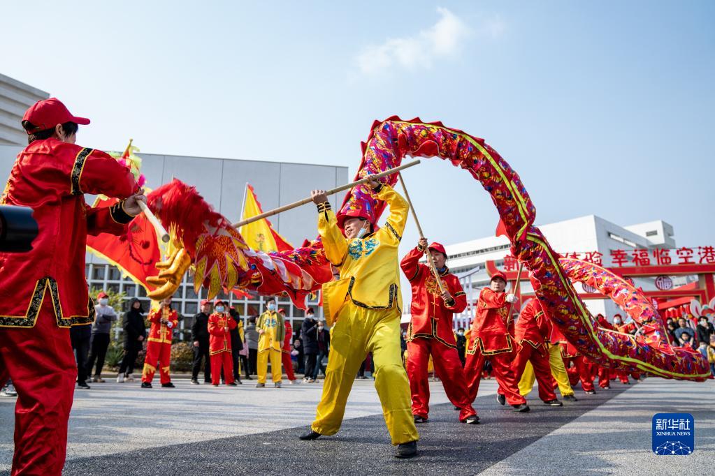 1月18日,市民在武漢市臨空港文化中心舉辦的兔年廟會(huì )集市上表演舞龍。