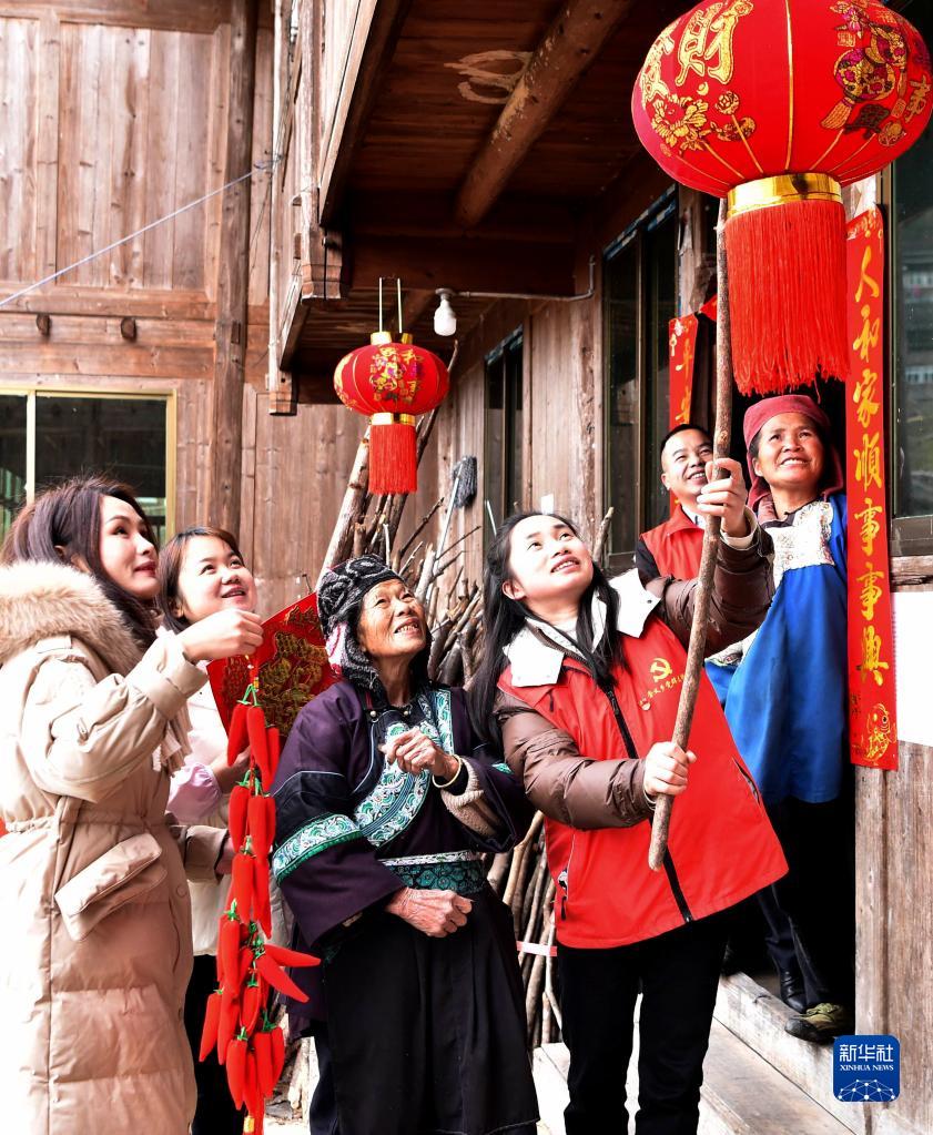 1月17日,貴州省榕江縣崇義鄉村干部和黨員志愿者在下咸村給獨居老人掛燈籠。