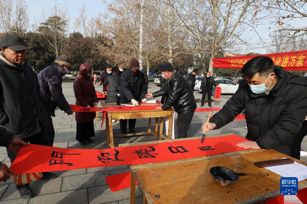 1月17日,在河南省焦作市溫縣文化廣場(chǎng),書(shū)法家為市民書(shū)寫(xiě)春聯(lián)。