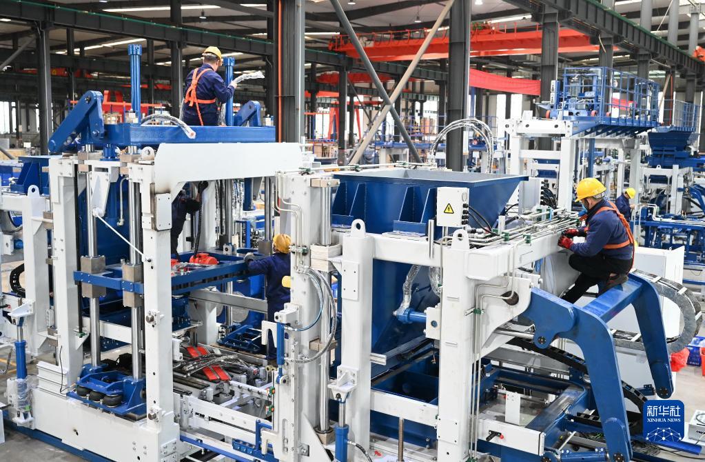福建泉工股份有限公司工作人員在安裝銷(xiāo)往海外的全自動(dòng)砌塊成型機(2022年12月14日攝)。