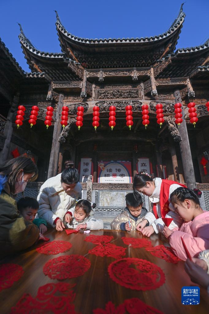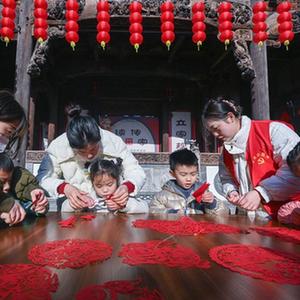 1月18日,在長(cháng)興縣李家巷石泉村的古建筑“百桌廳”內,孩子們在志愿者的帶領(lǐng)下學(xué)習剪紙。