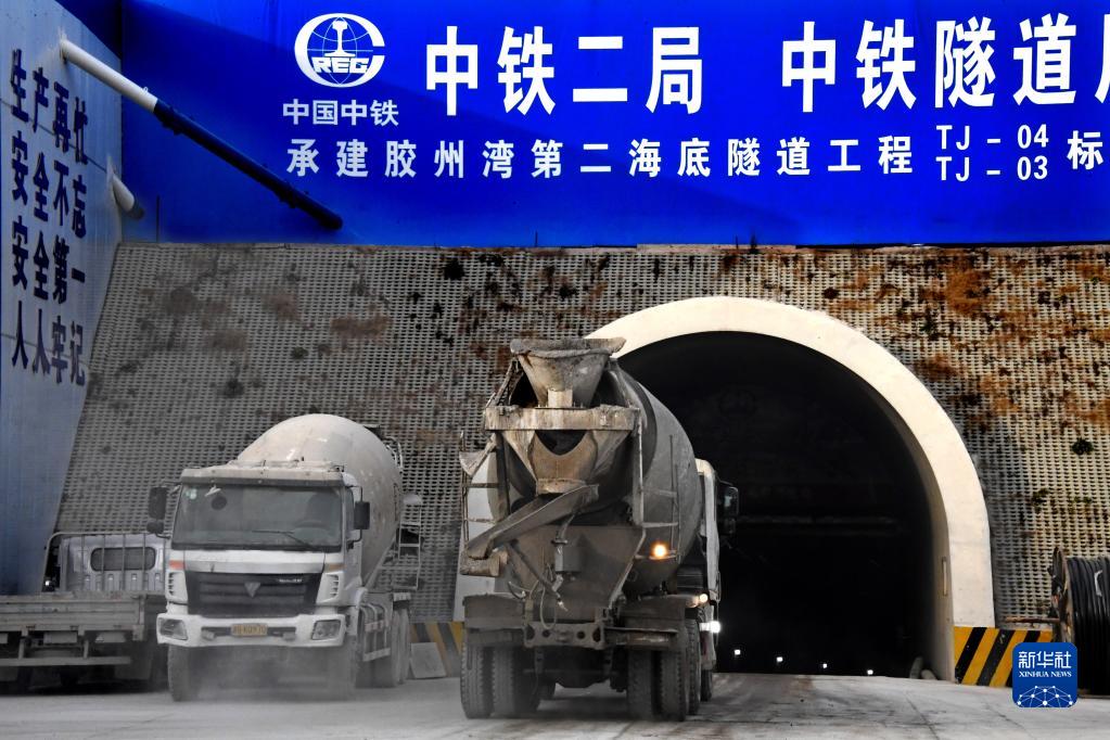 1月17日,運送水泥的工程車(chē)輛準備從施工隧道進(jìn)入海底。