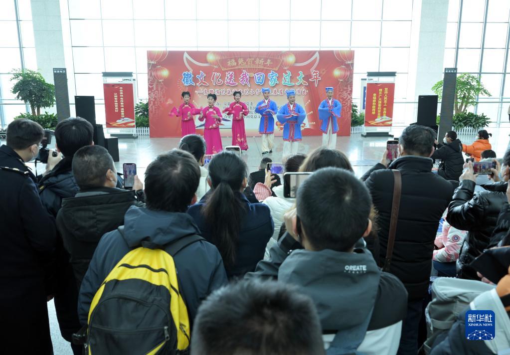 當日,一場(chǎng)“徽文化送我回家過(guò)大年”活動(dòng)在合肥南站舉行,安徽省黃梅戲劇院多位演員在候車(chē)大廳內為旅客帶來(lái)精彩的黃梅戲演出,營(yíng)造濃厚的春節氛圍,讓廣大旅客回鄉路上體驗濃濃“年味”。