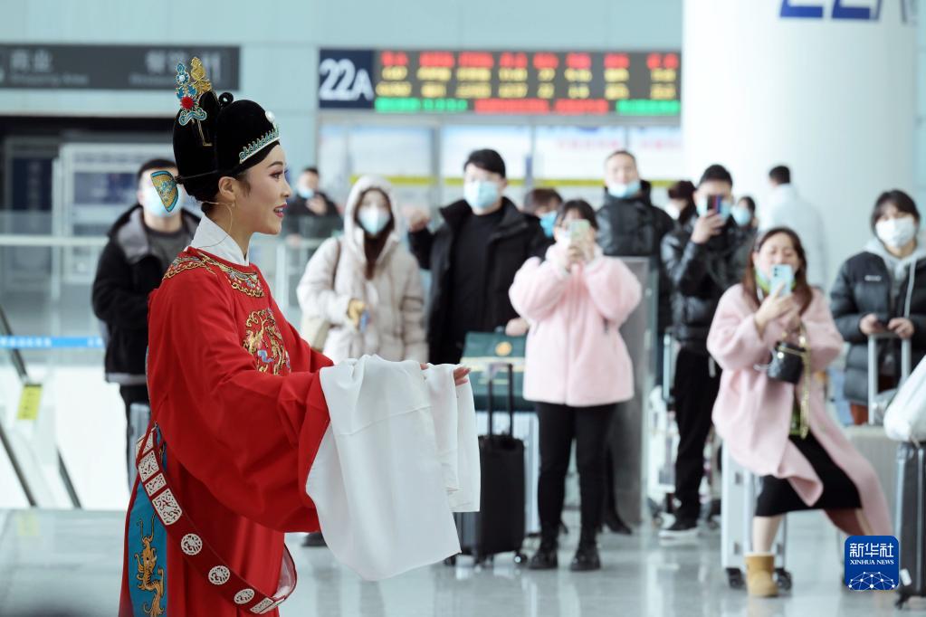 當日,一場(chǎng)“徽文化送我回家過(guò)大年”活動(dòng)在合肥南站舉行,安徽省黃梅戲劇院多位演員在候車(chē)大廳內為旅客帶來(lái)精彩的黃梅戲演出,營(yíng)造濃厚的春節氛圍,讓廣大旅客回鄉路上體驗濃濃“年味”。