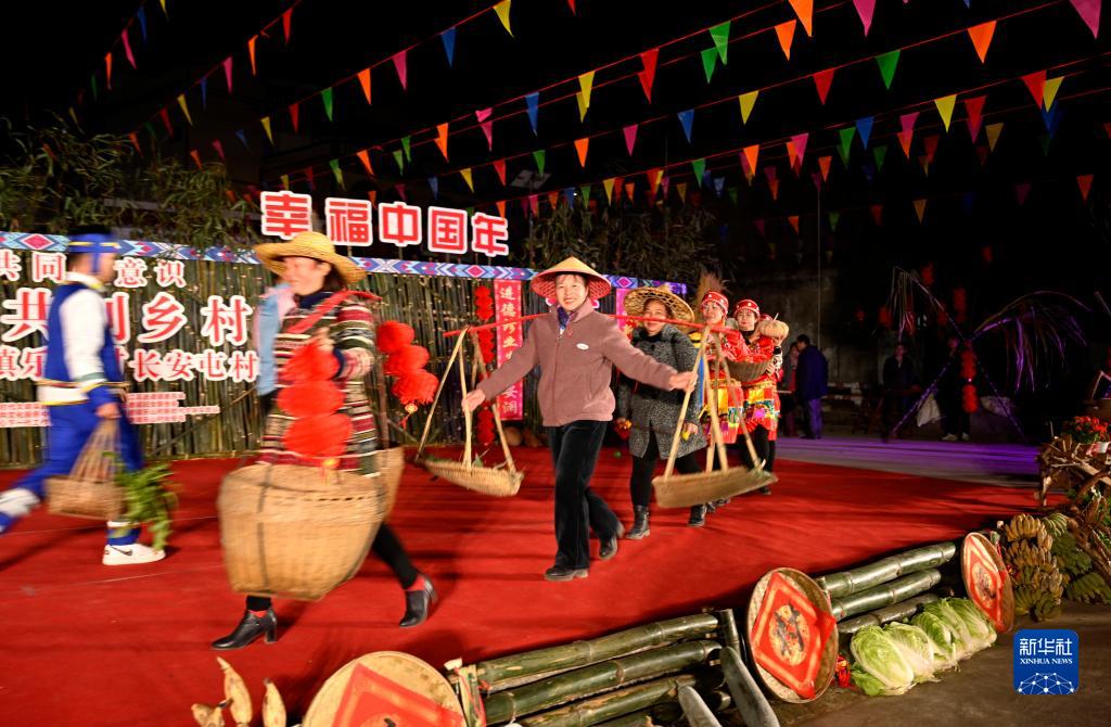 1月17日晚,村民扛著(zhù)農具在“村晚”活動(dòng)上走秀。