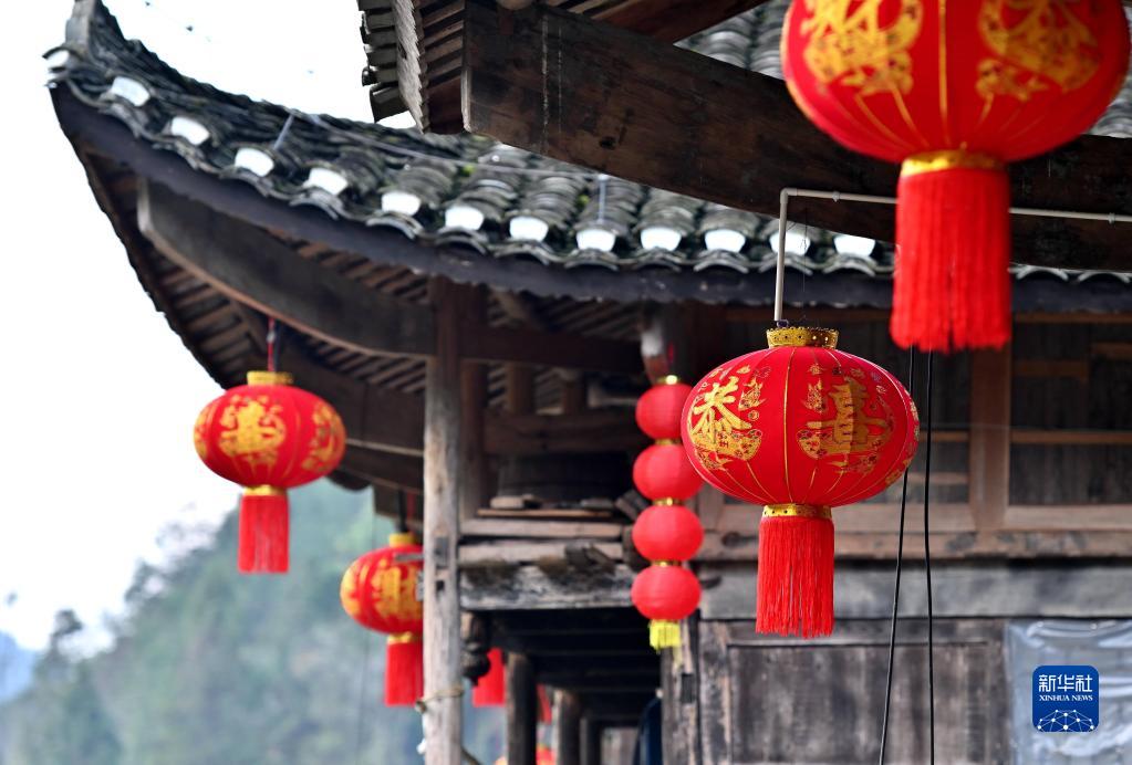 湖北省宣恩縣沙道溝鎮彭家寨吊腳樓懸掛著(zhù)紅燈籠(1月18日攝)。