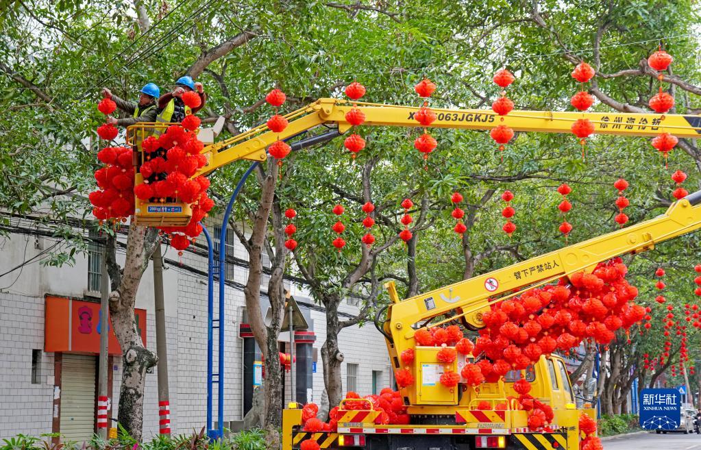 1月18日,在廣西南寧市邕寧區紅星路,市政工作人員懸掛燈籠。