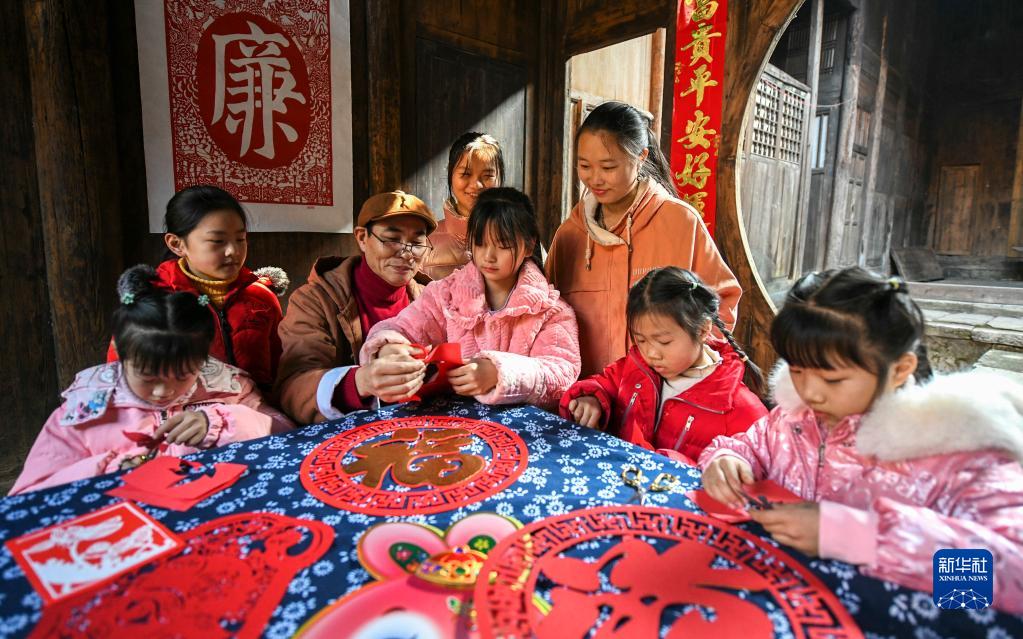 1月18日,在常寧市廟前鎮中田古村,常寧市剪紙非遺傳承人指導小朋友們練習“廉”字、“?!弊?。