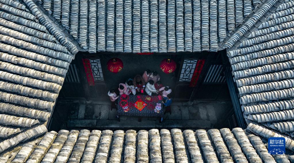 1月18日,在常寧市廟前鎮中田古村,常寧市剪紙非遺傳承人指導小朋友們練習剪“廉”字、“?!弊郑o(wú)人機照片)。