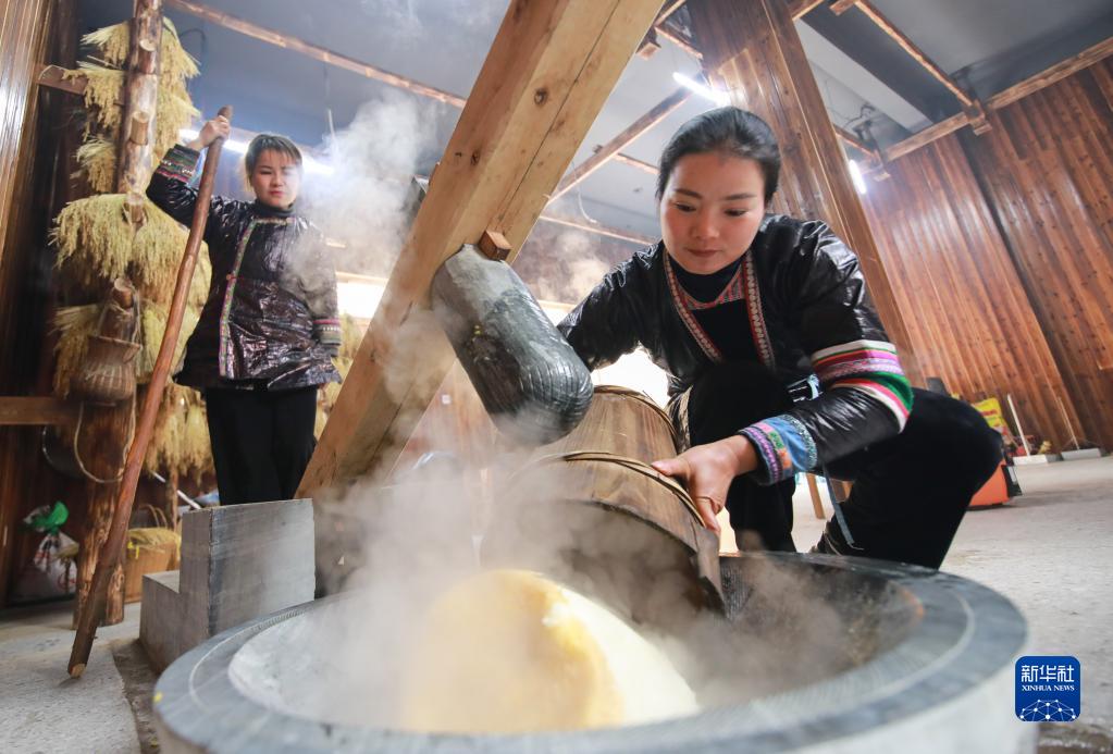 1月18日,貴州省黔東南苗族侗族自治州從江縣高增鄉占里村村民在舂糯米飯制作糍粑。糯米糍粑是當地侗族群眾過(guò)年必備的傳統食品,寓意團團圓圓。