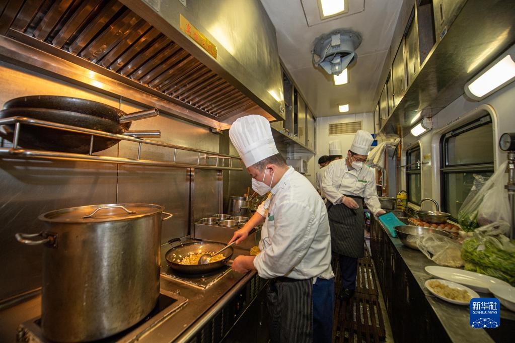 1月18日,K209次列車(chē)餐車(chē)工作人員在為旅客們準備晚餐。