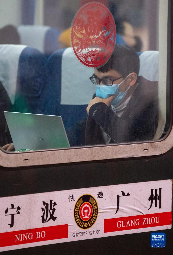 1月18日,旅客在K209次列車(chē)上看電腦。
