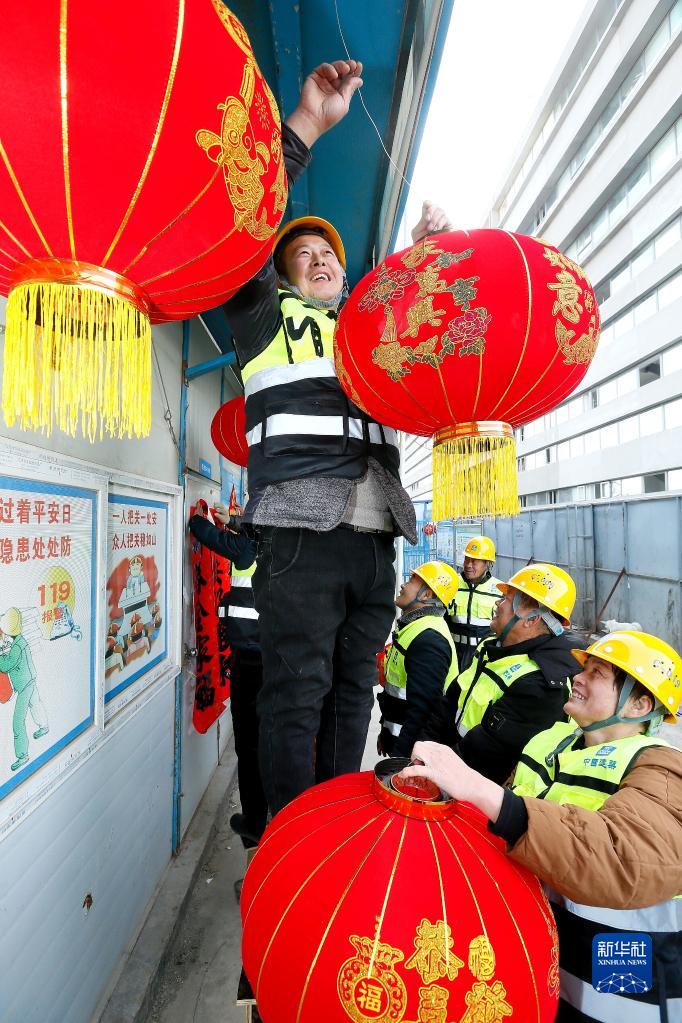 1月19日,在山東省青島市即墨區陸港臨空云創(chuàng )中心項目工地,中建八局四公司務(wù)工人員在生活區掛燈籠。