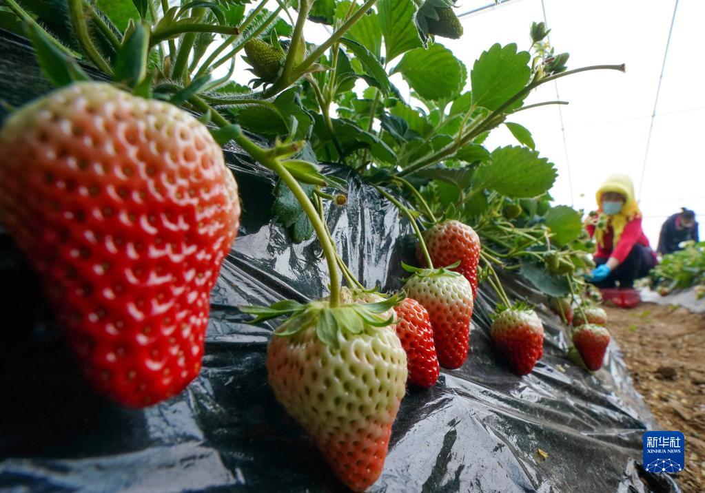 1月19日,唐山市豐潤區任各莊鎮的農民在大棚內采摘草莓。