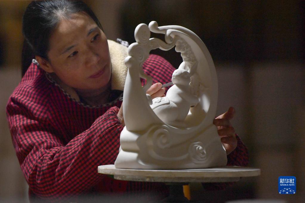 1月18日,在寶豐縣張八橋鎮一家汝瓷生產(chǎn)企業(yè),汝瓷藝人在修飾汝瓷生肖兔素胎。