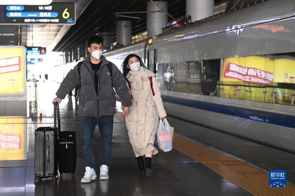 乘坐D2246/D2247次列車(chē)的返鄉旅客甘德鑫(左)與女友唐敏在杭州東站登車(chē)(1月18日攝)。24歲的甘德鑫與女友畢業(yè)于同一所大學(xué),目前都在杭州工作,準備回到重慶過(guò)年,“雙方都見(jiàn)了家長(cháng)”。