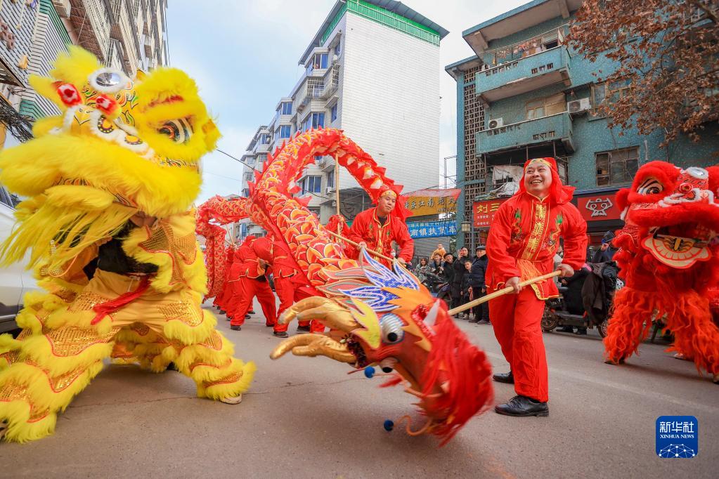 1月19日,民間藝人在四川省遂寧市蓬溪縣蓬南鎮街頭表演舞龍、舞獅。