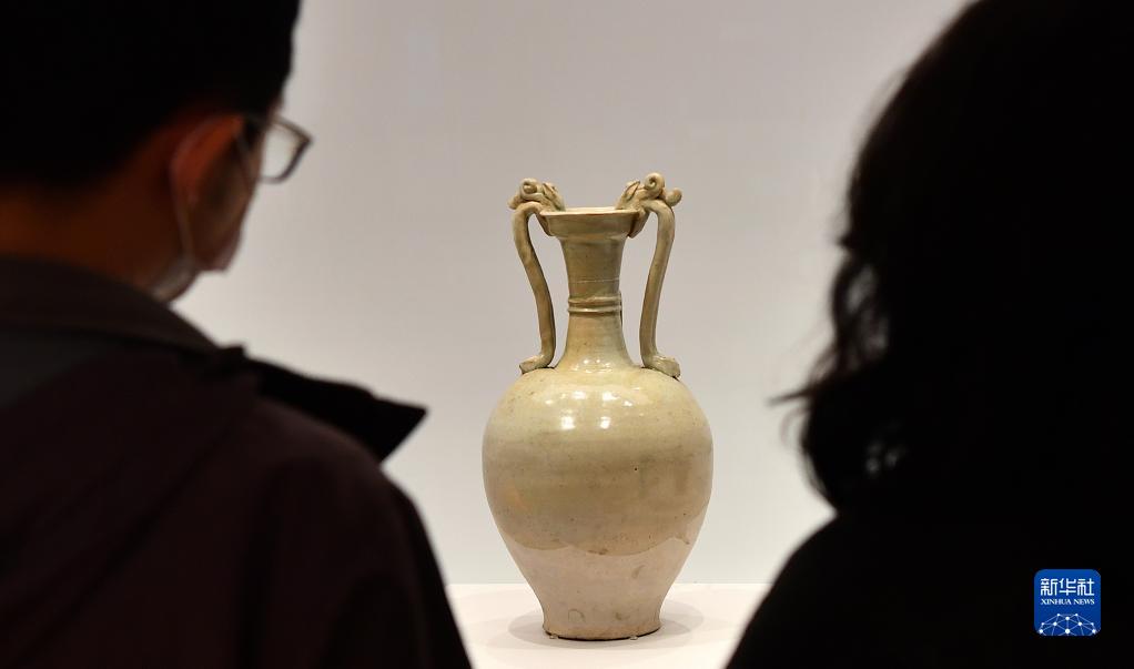 1月19日,觀(guān)眾在觀(guān)看“白釉龍耳盤(pán)口瓶”。