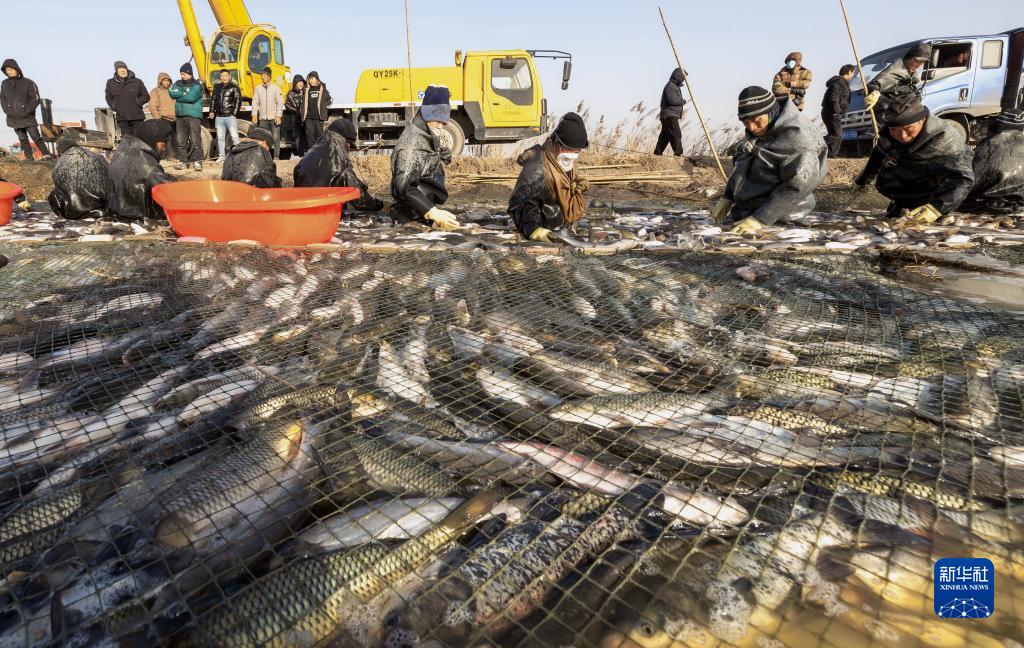 1月20日,唐山市豐南區老鋪村的村民在魚(yú)塘捕撈淡水魚(yú)。