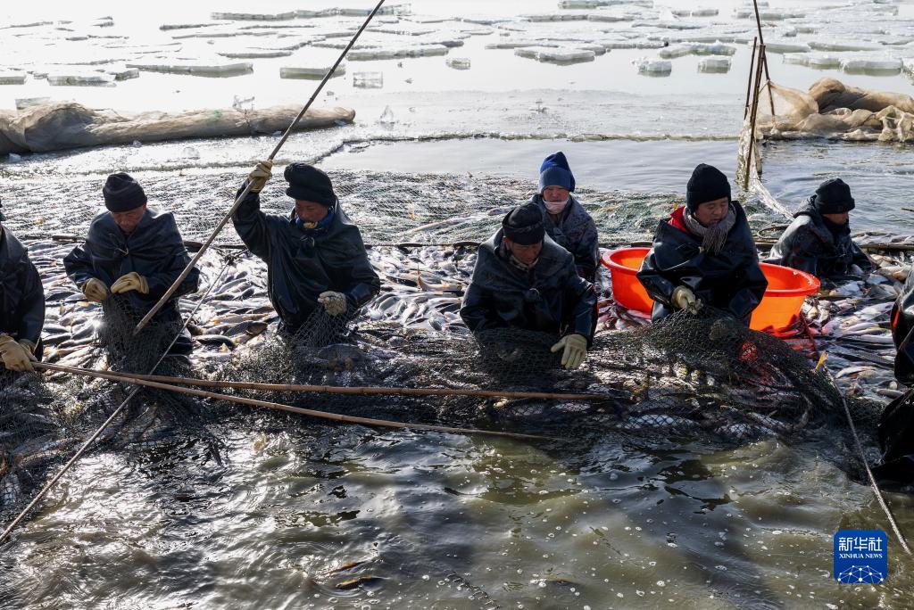 連日來(lái),河北省唐山市豐南區的水產(chǎn)養殖戶(hù)們忙著(zhù)在池塘內破冰捕魚(yú),以供應春節市場(chǎng)。