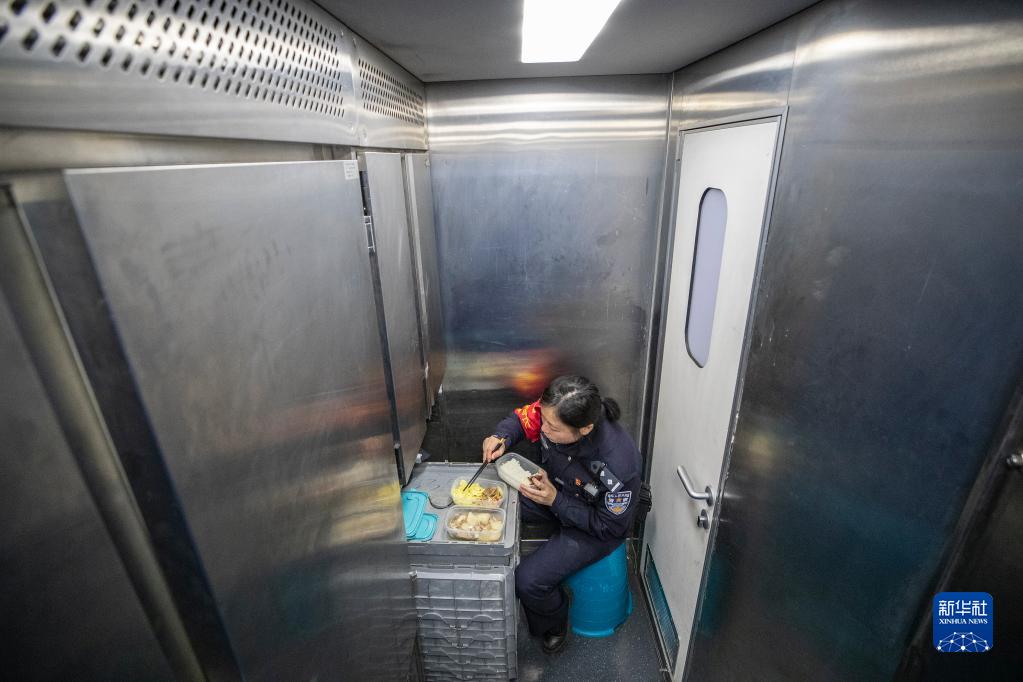 1月16日,在貴陽(yáng)北開(kāi)往西安北的D1703次列車(chē)上, 重慶鐵路公安處乘警支隊“芳華”女子乘務(wù)警組的朱小麗巡視完車(chē)廂后吃午飯。