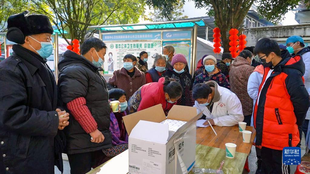 1月19日,醫護人員在四川省石棉縣新民鄉衛生院為當地居民發(fā)放捐贈的藥品。