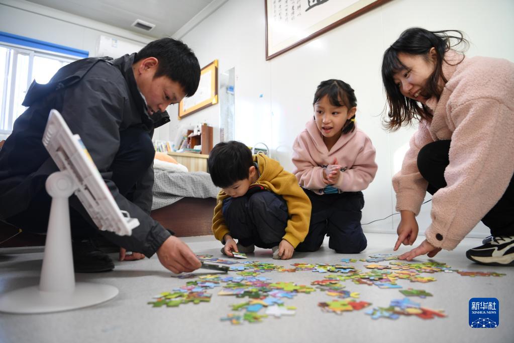 1月18日,李輝和家人在項目部宿舍內玩拼圖游戲。