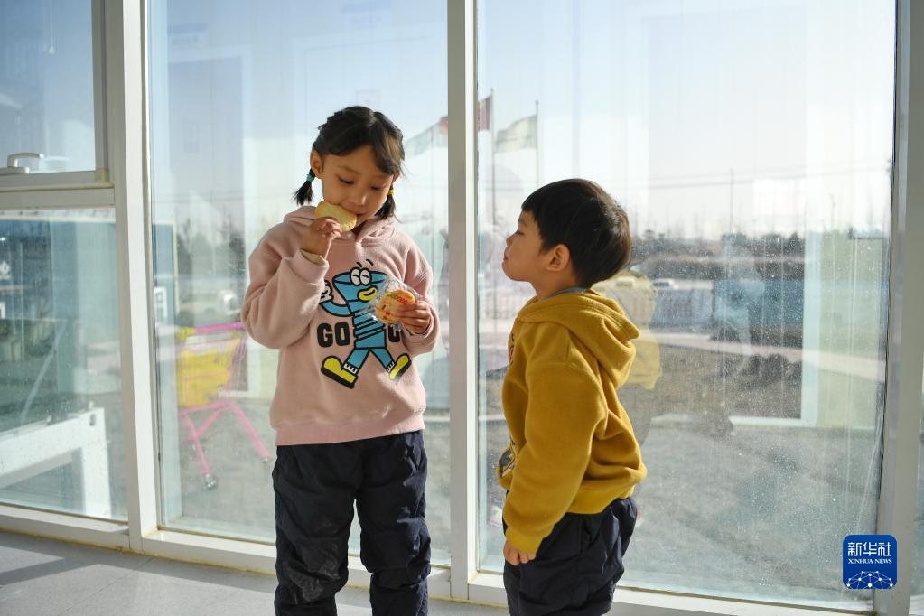 1月18日,李輝的女兒和兒子在樓道內吃零食。