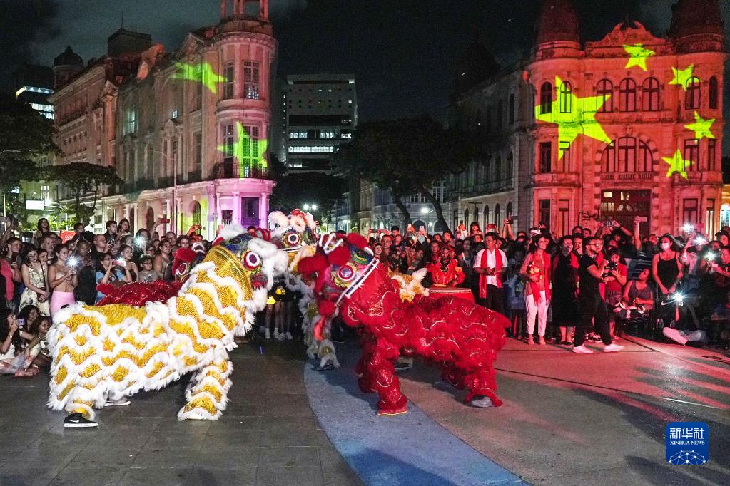 巴西東北部城市累西腓19日晚舉行中國春節慶?;顒?dòng),通過(guò)中巴歌舞、舞獅表演、燈光秀等精彩節目喜迎兔年新春。2022年,累西腓市通過(guò)法案,將中國春節設立為該市的官方節日。