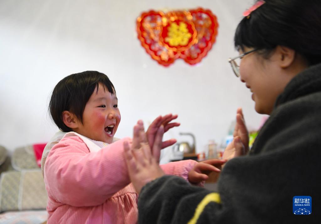 1月19日,呂海云和女兒靳佳穎做游戲。