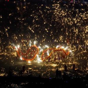 1月18日,重慶市銅梁區的龍城天街的廣場(chǎng)上,銅梁火龍隊的隊員們表演銅梁火龍。